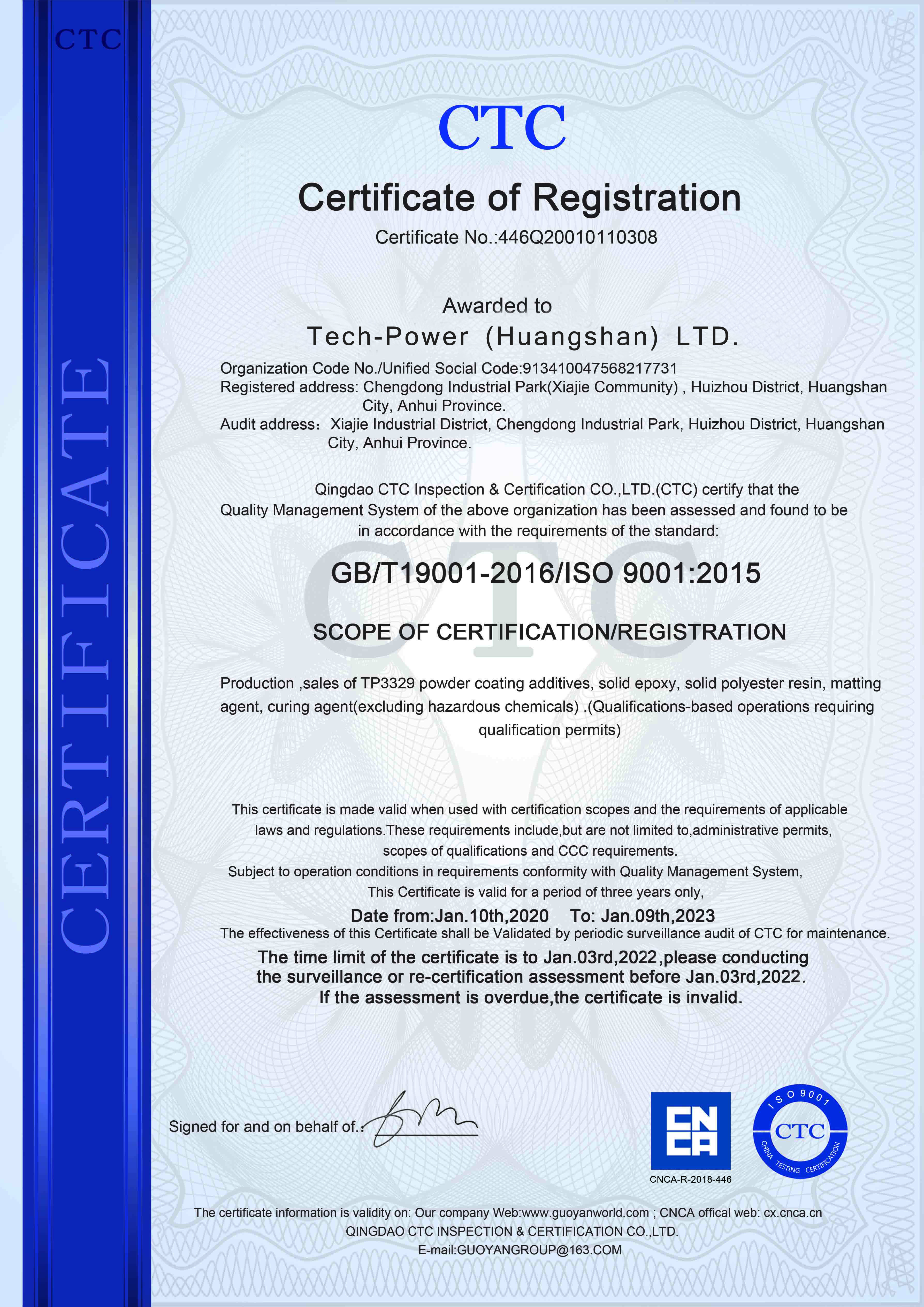 - Start from 2003 and based on innovation as foundation and honesty first, Tech-power (Huangshan) LTD .has 27000 square meters modernized plant where lies in chemical industrial estate and 4 well - equipped workshops, advanced R & D center, quality inspection centre. .Our main products are 9 series ,more than 50 kinds of powder coating additives including matt hardener ,matting agent , leveling agent,curing accelerators...
